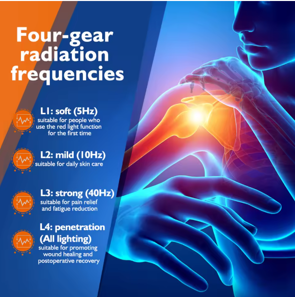 3. Red Light Therapy—three red light modes (660/850/ALL), four radiation frequencies (5Hz/10Hz/40Hz/full brightness), effectively relieves pain, promotes wound healing, reduces inflammation, relieves muscle fatigue, and improves skin condition.